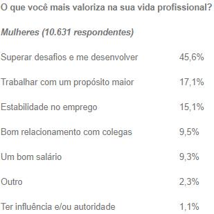 Questionados quanto a qual seria o maior desafio de suas vidas profissionais, 23,1% das mulheres e 21,2% dos homens citaram “alcançar estabilidade financeira”. “Achar um trabalho com o qual eu me identifique” e “Manter-me motivado” ficaram em, respectivamente, segundo e terceiro lugar, tanto na concepção das mulheres quanto na dos representantes do sexo masculino.